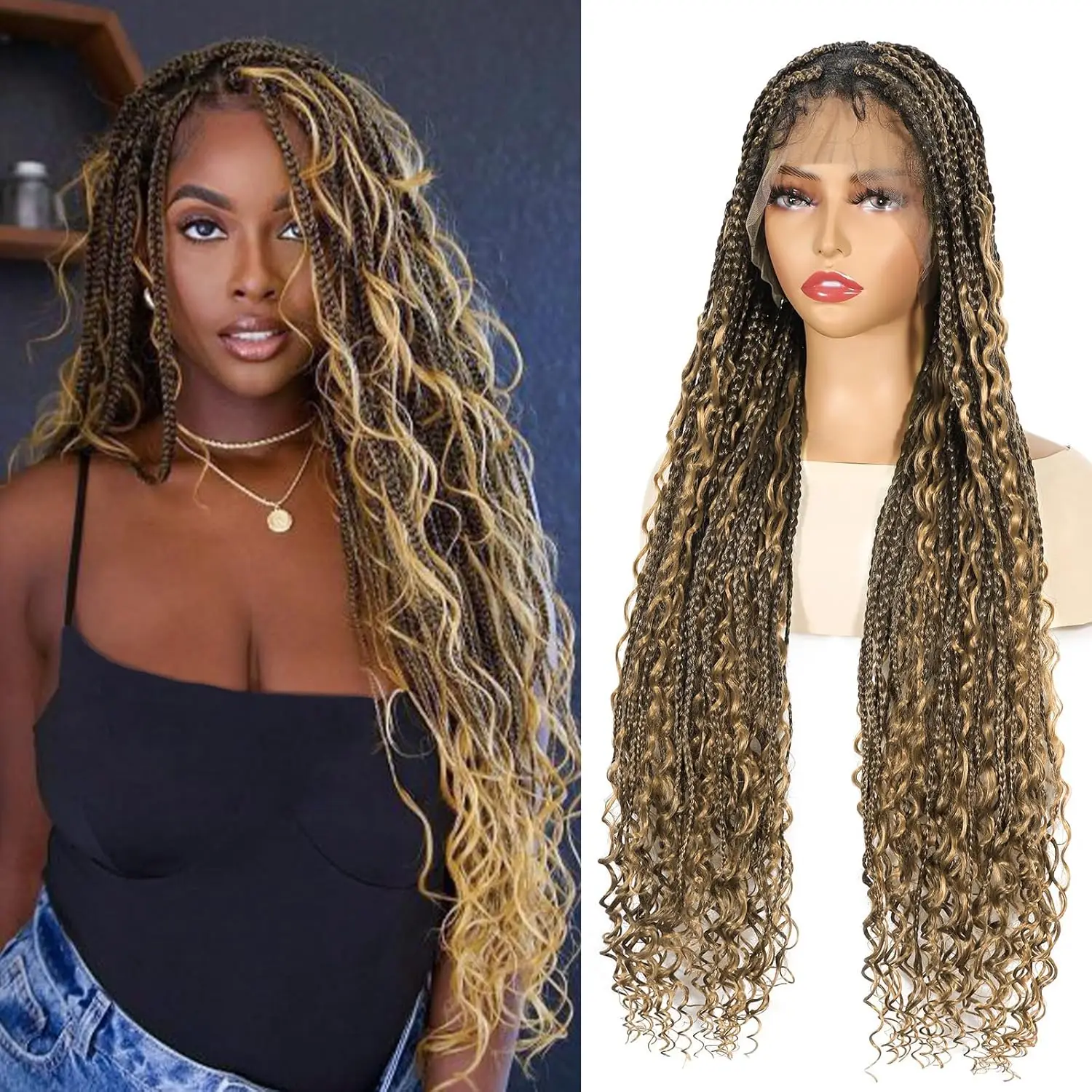 Bohemian Knotless Braided Wig – Golden Blonde with Curls