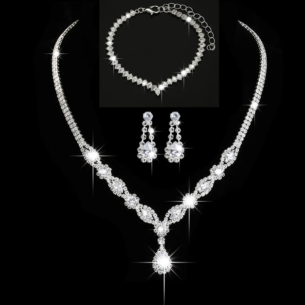 - Necklace: The necklace showcases a delicate chain adorned with a stunning centerpiece of cubic zirconia, designed to enhance your neckline and draw attention to your beauty.