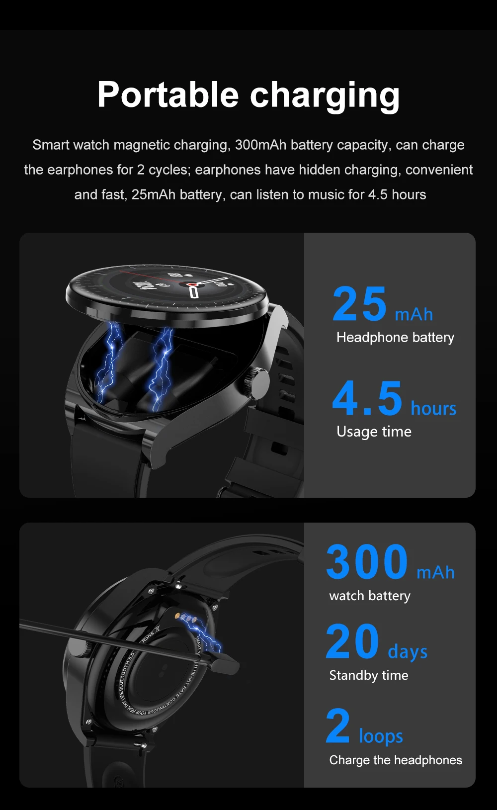 - Battery: Rechargeable lithium-ion (for both smartwatch and earbuds)