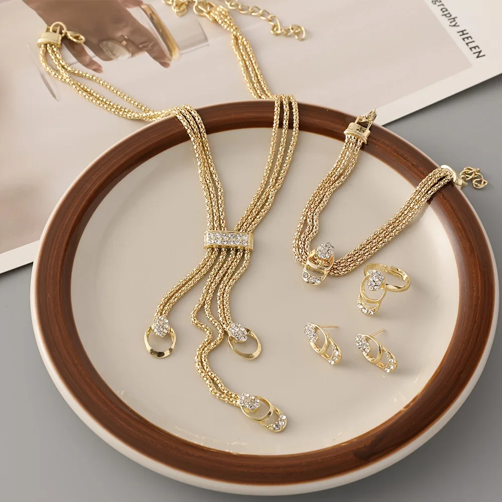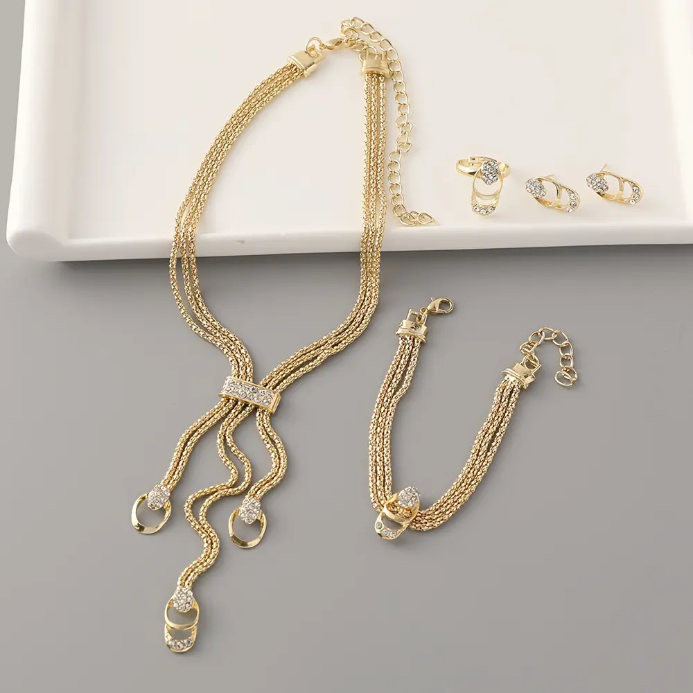Elevate your bridal look with our stunning Gold Tone Wedding Jewelry Set. This exquisite 4-piece ensemble includes a beautifully designed necklace, elegant earrings, a matching ring, and a delicate bracelet, all crafted to add a touch of glamour to your special day.