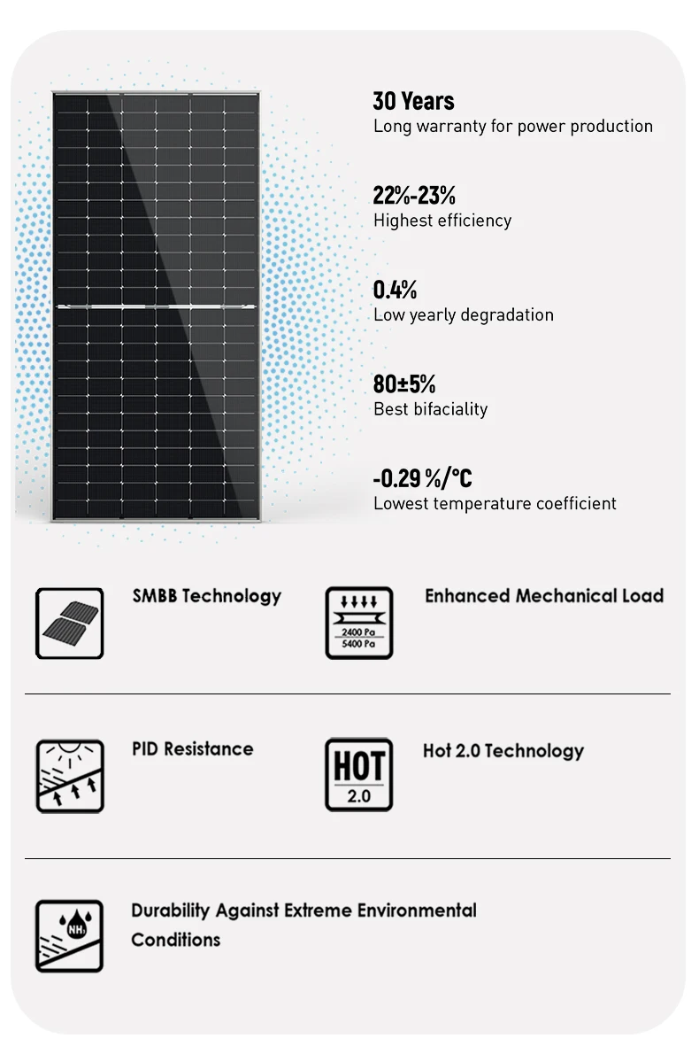 - N-Type Monocrystalline Technology: Utilizing advanced N-Type cells, this solar panel offers superior efficiency and performance, particularly in low-light conditions, resulting in higher energy yields throughout the day.