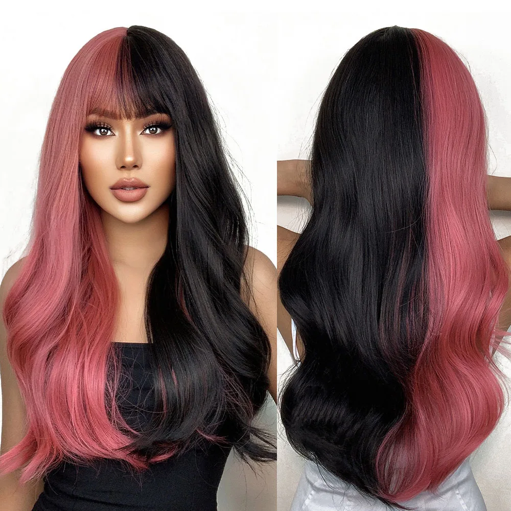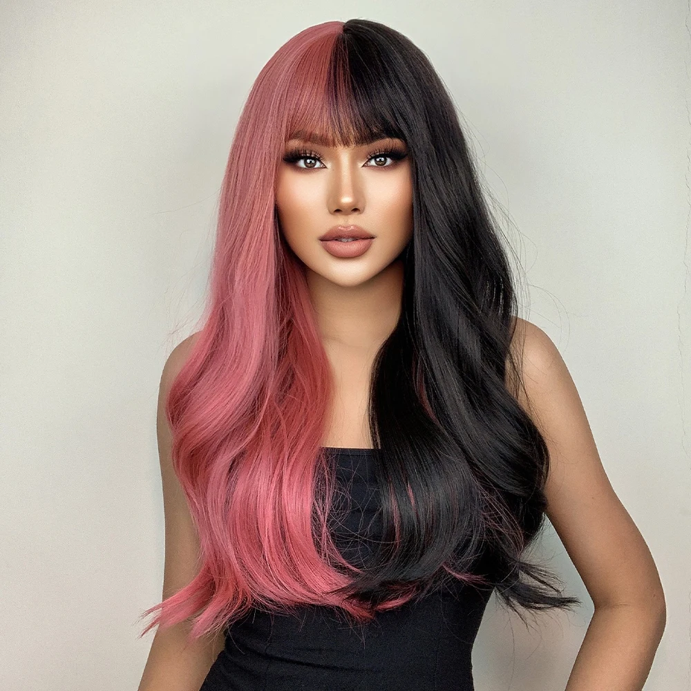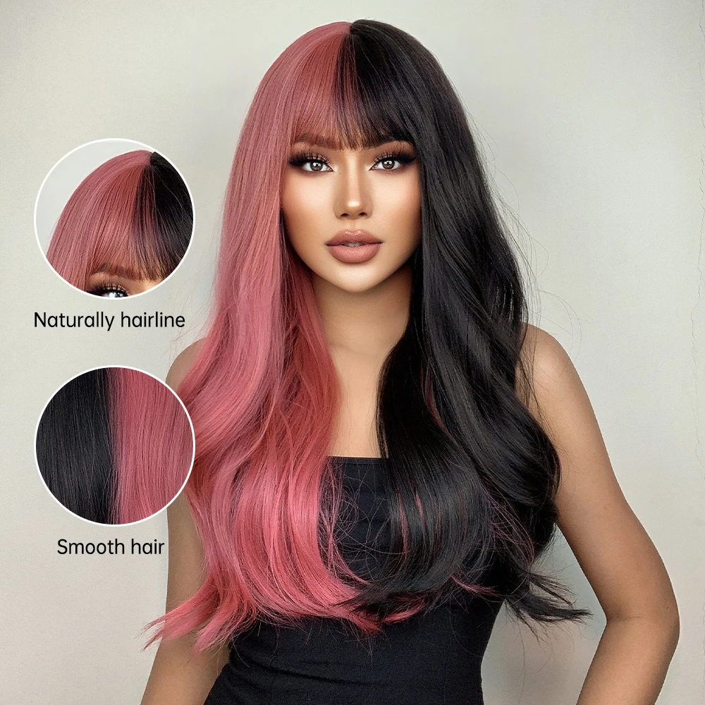 Pink Black Ombre Wavy Wig with Bangs – Heat Resistant Cosplay Hair