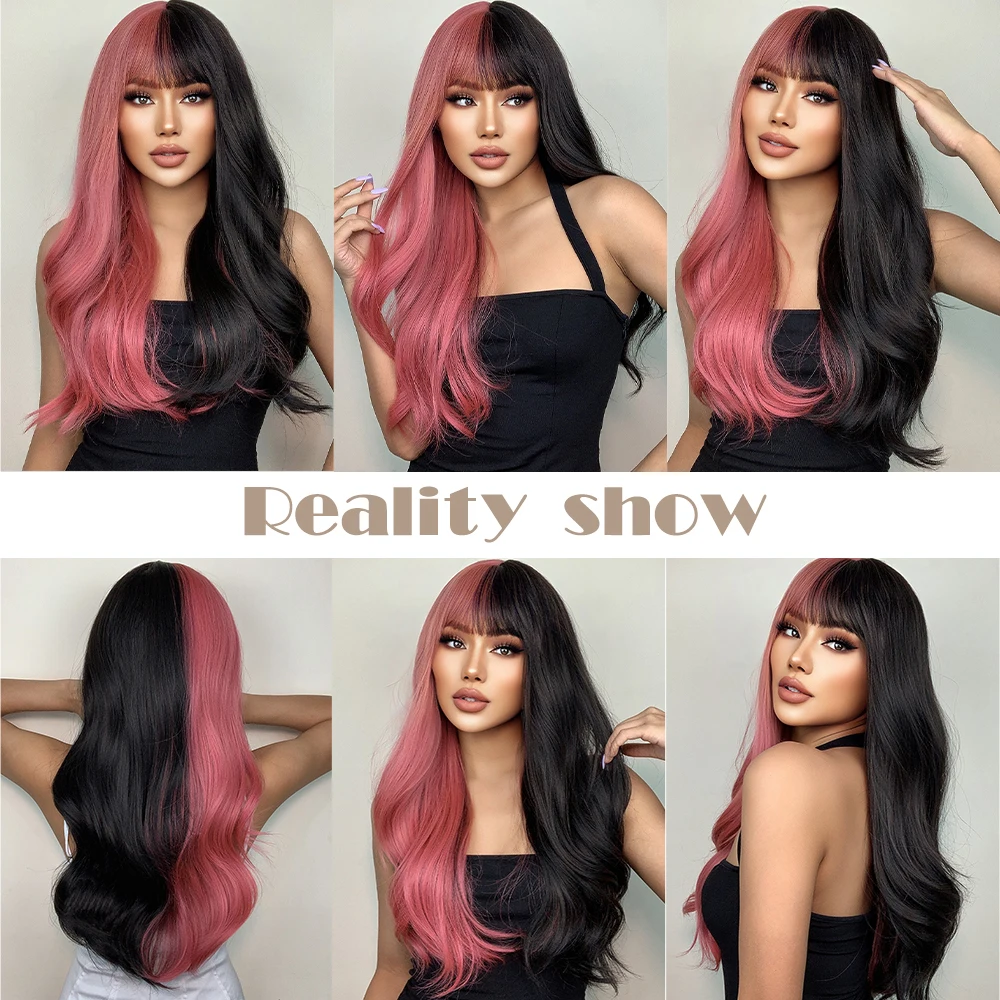 Unleash your creativity with our Pink Black Ombre Wavy Wig with Bangs! Perfect for cosplay, Halloween, or just adding a fun twist to your everyday look, this wig combines vibrant colors and stylish design to help you stand out in any crowd.