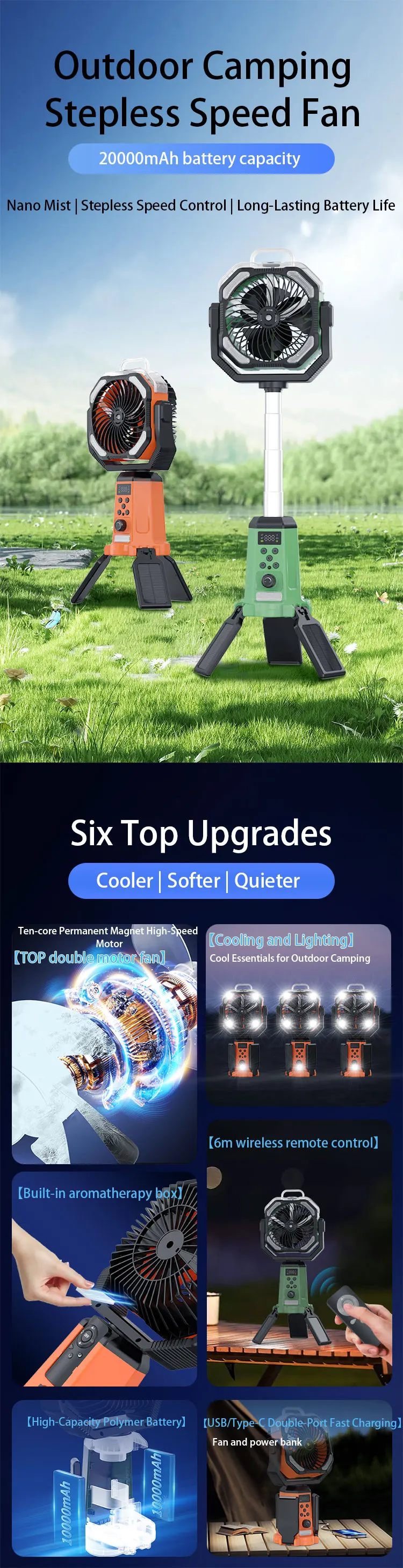 • 20000mAh Battery: Equipped with a high-capacity lithium battery, this fan provides extended run times, allowing you to enjoy cooling relief for hours on a single charge.